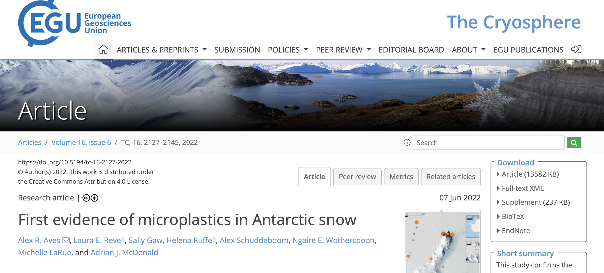The average concentration of microplastics was 29 particles per liter of snow. Most were less than 1000 µm and the most common plastic was polyethylene terephthalate (PET). Interestingly, this was a higher concentration of microplastics than was found in the surrounding Ross Sea. Fiber was the most common morphotype, which is in line with most environmental sampling findings.