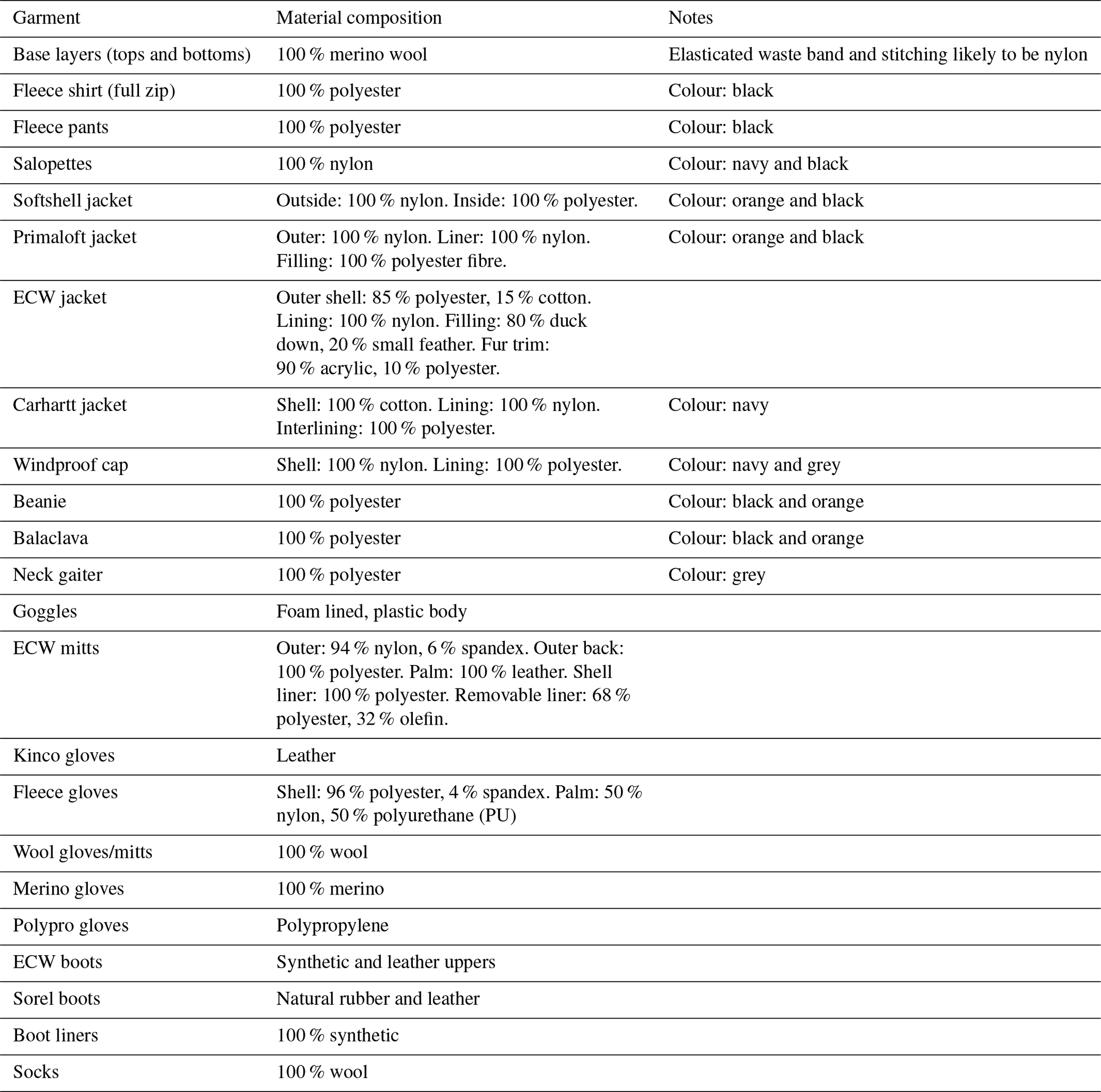 “Catalogued material used in New Zealand Antarctic programme gear.” from Aves et al. (2022), First evidence of microplastics in Antarctic snow, The Cryosphere, 16, 2127–2145, licensed under Creative Commons Attribution 4.0 International (CC BY 4.0). Original source: https://doi.org/10.5194/tc-16-2127-2022. No changes made.